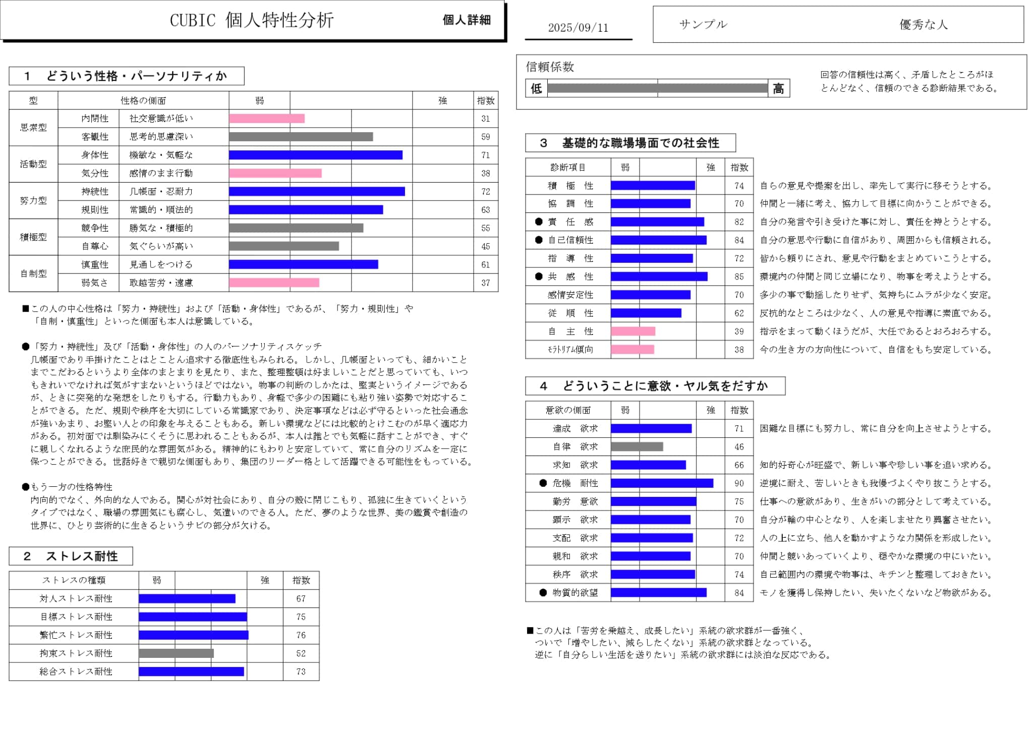 自分自身を信じられるか、いかなる場面でも気持ちの安定を保てるかなどで総合ストレス耐性を算出しています。