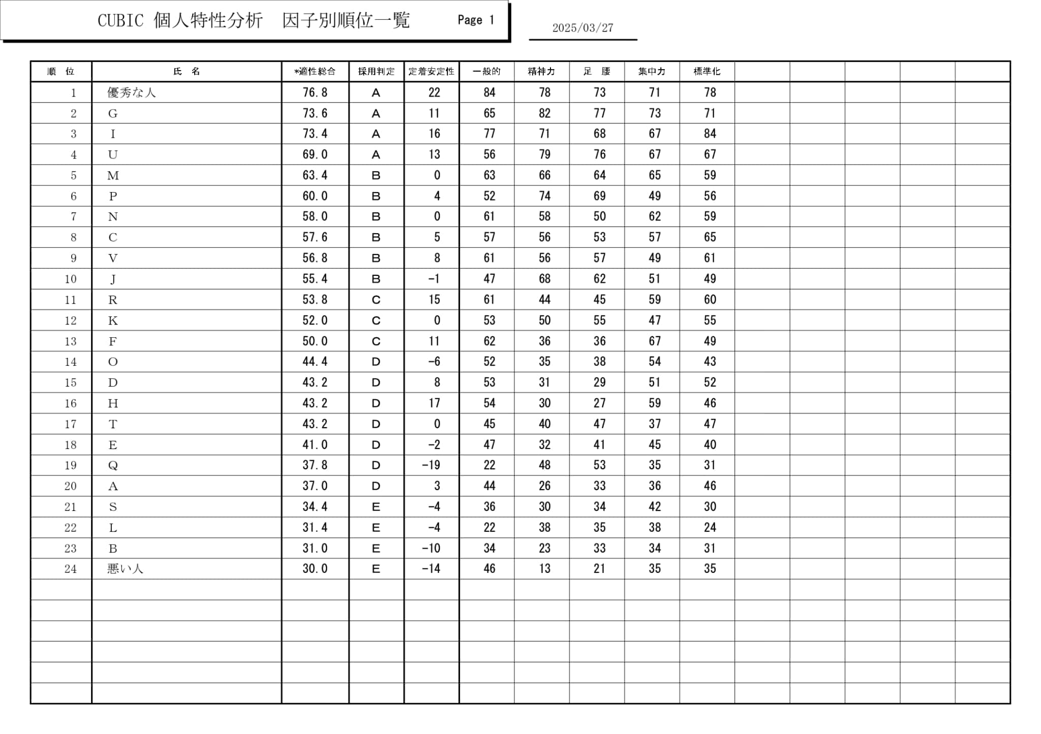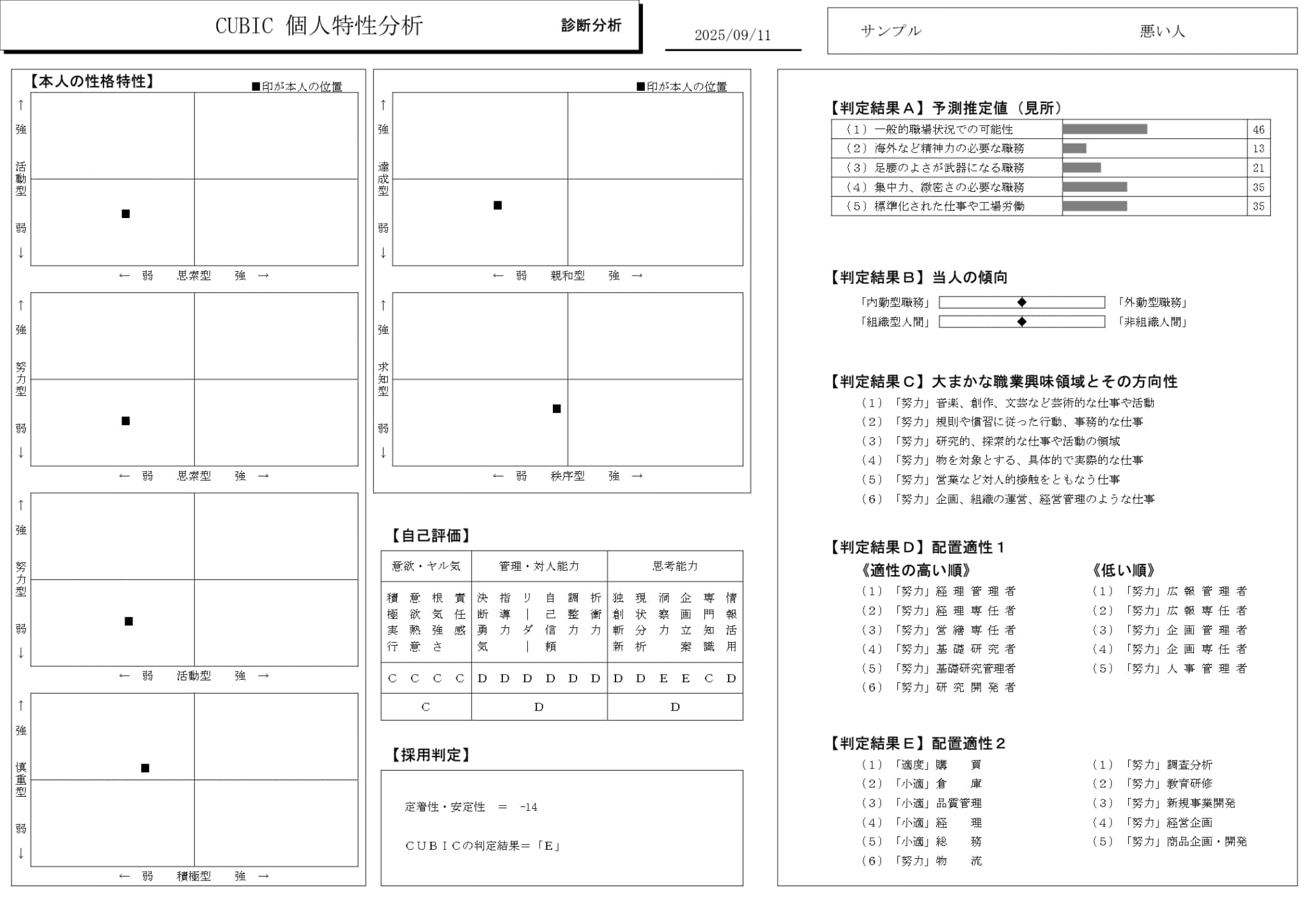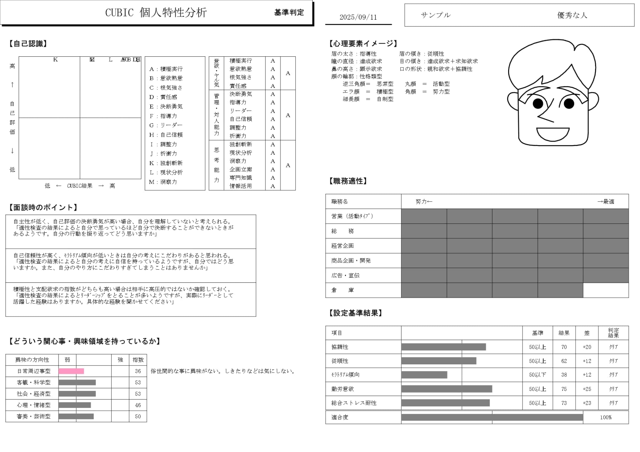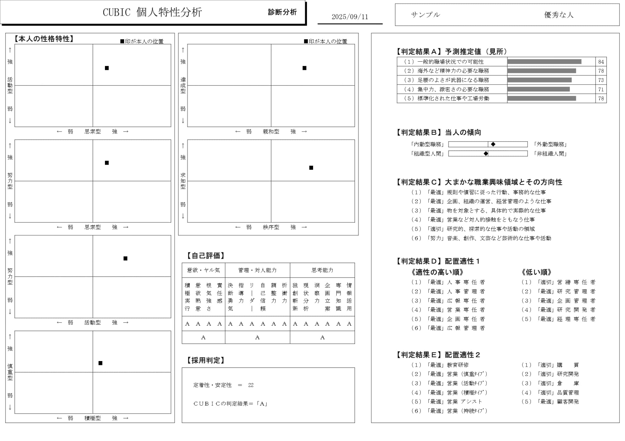 CUBIC適性検査は、組織にふさわしいか否かを判断するだけでなく、 この人にはこういう仕事が向いているのではないかといった、予測・可能性のもとで、 会社内の人事を科学的・合理的に進めていくことができます。