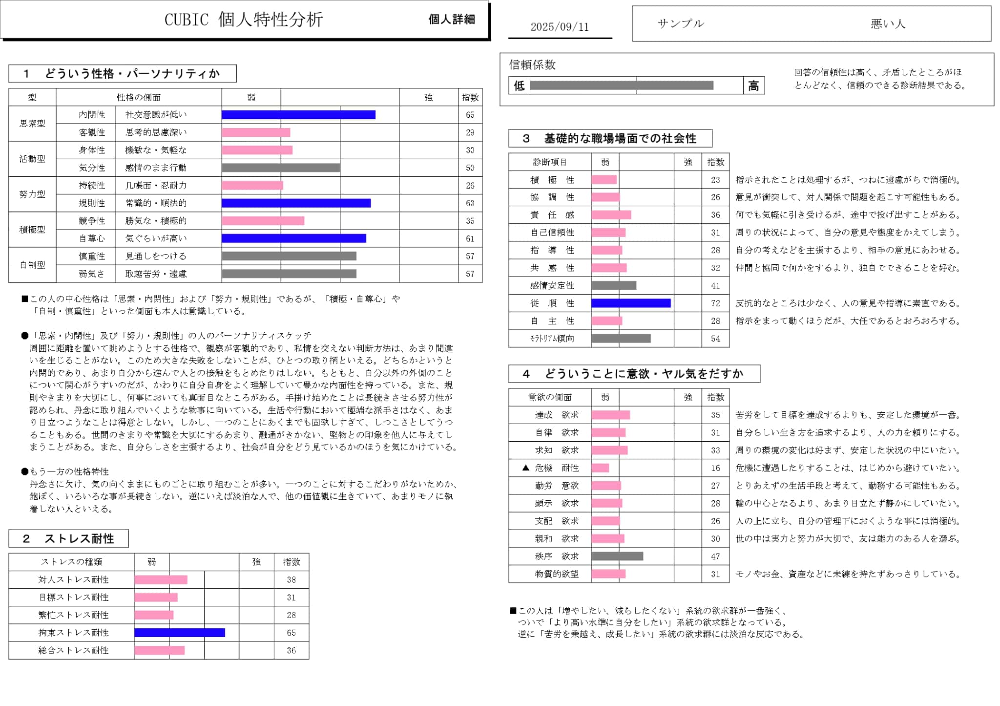 受検者が意図的に自分の結果を良くしようと考え過ぎて回答をすると回答に矛盾が生じ、信頼係数が低くなる場合が多いようです。