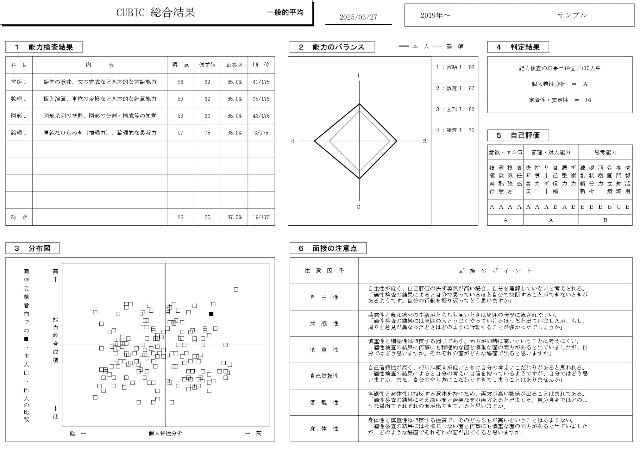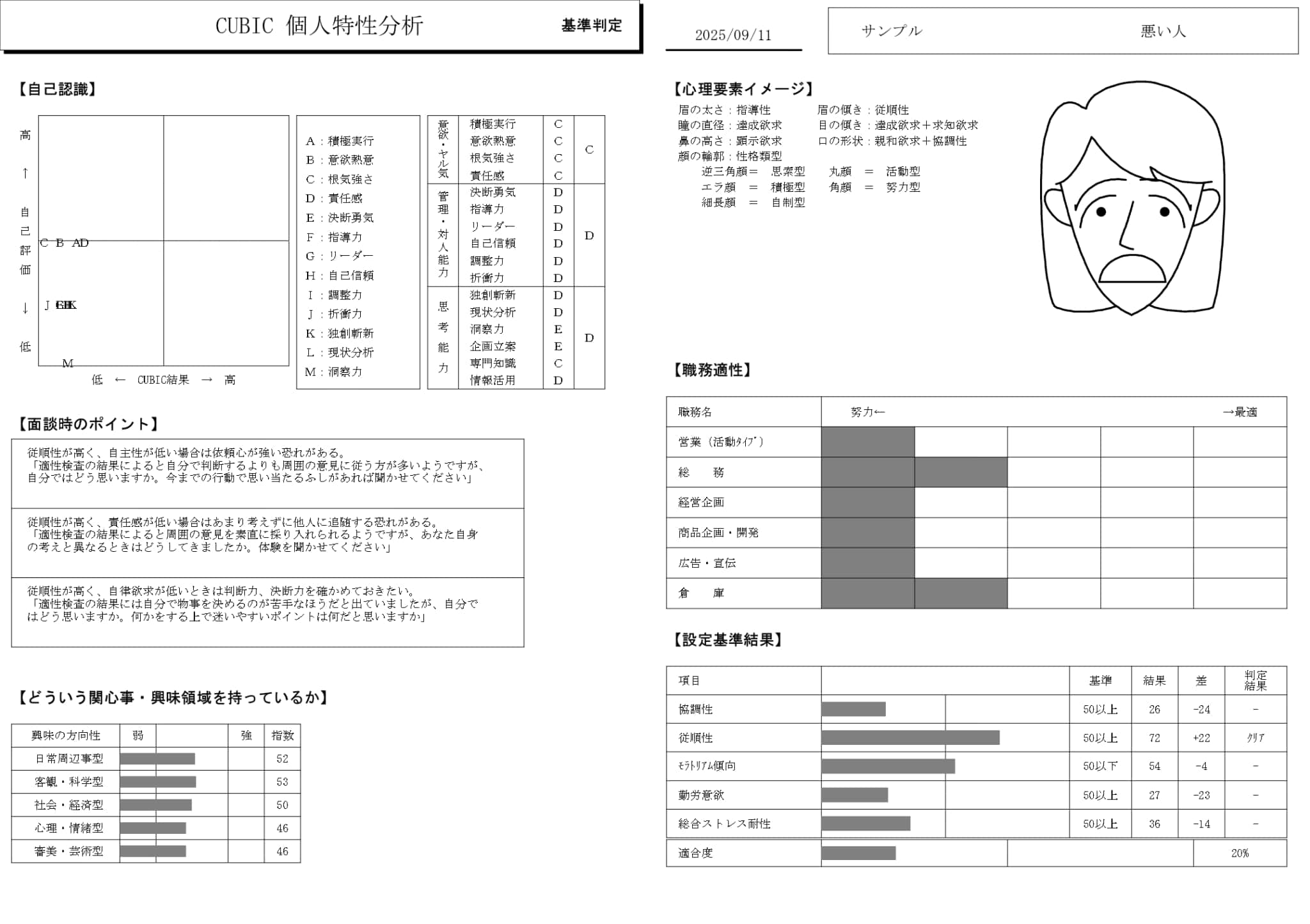 CUBIC適性検査は、面接時の留意点を確認したり、採用判定の基礎データとして活用できます。 また、採用後の配置先の検討資料としても活かせます。